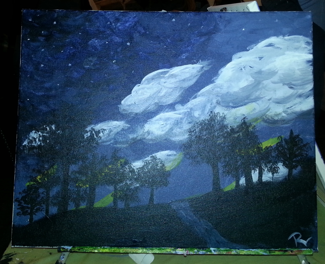 You can see I missed the memo regarding leafy trees, a stream and stars – as in none of those are in the original painting.  I and five other wanna-be-on-a-musuem-or-at-least-mom’s-wall-one-day shared a table and had a blast.  Well, five of us had a blast. One young woman became so frustrated with hers, she  just started putting gobs of paint on her canvas. The result was something along the lines of Pollack meets Picasso with some Van Gough swirlies tossed in. It turns out all of us at our table were the resident trouble makers in that we each did something with our respective paintings that was not “in the script”: a Christmas tree, a hawk against a sky of muted purples and pinks, trees with snow, one with no trees, but tall grass instead and my stream, stars and leafy trees instead of pines. Creative license indeed.