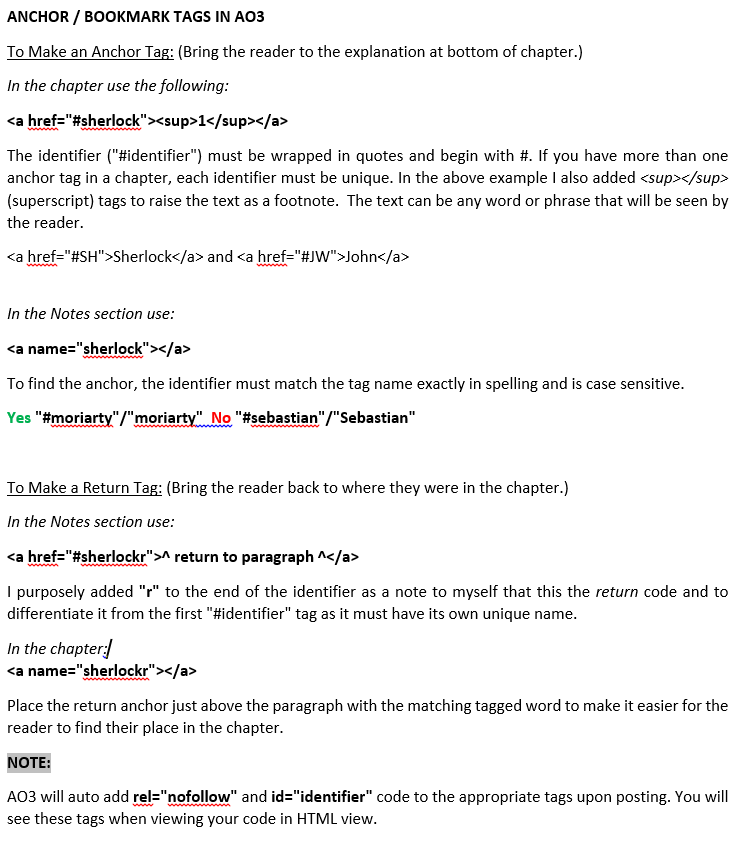 anchor tags Published November 3, 2018 at 739 × 844 in anchor tags How to create anchor/bookmark tags in AO3 Share this! Print (Opens in new window) Print Share on TumblrTweet Share on WhatsApp (Opens in new window) WhatsApp Email a link to a friend (Opens in new window) Email Like Loading...